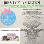 August marks the month of transition between The Scentsy Spring / Summer Catalogs and the Scentsy Fall/Winter catalog products. With that, almost the entire Spring / Summer catalog is on SALE (certain exclusions may apply, i.e.. Combine & Save, Licensed Products, Charitable Cause Items, Closeout items, Enhanced Consultant Starter Kit, Warmer & Scent of the Month, etc.) from August 1, 2018 – August 31, 2018! Please also check as to which items are being discontinued from the Spring Summer 2018 Catalog.